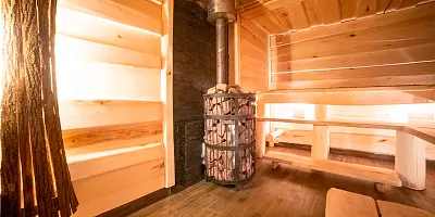 Попасть в баню очень просто, ведь дверь в неё ведёт прямо из гостиной. В любое удобное для себя время можно начать подкидывать дрова в топку, пару часиков и можно идти в парилку. Особенно это оценят любители зимних развлечений, рыбалки и охоты.